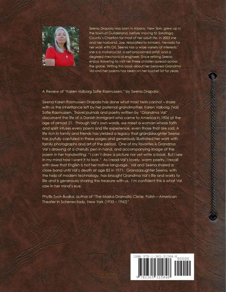 This book details the history of Karen Sofie Valborg Rasmussen, with photographs and poems. She was a governess, seamstress, mother, wife, and widow who emigrated from Denmark in 1906. She lived in Schenectady, New York for her remaining years, returning to Denmark at least twice. She was a founding member of the Danish Sisterhood Society Lodge #142 in Schenectady and encouraged the assimilation of many young immigrant Americans. She was a seamstress in great demand in the days before store bought clothes. She befriended and sewed for many of the society ladies in the community. Her poems are infused with caring, faith, friends, family, and most of all encouragement. Author, Seena Karen Rasmussen Drapala, her granddaughter, recounts her memories of her beloved Grandma Val.