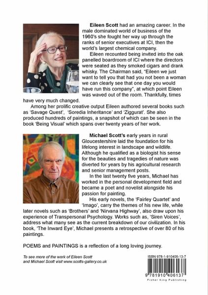 Eileen Scott has had an amazing career. In the male dominated world of business of the 1960¿s she fought her way up through the ranks of senior executives at ICI, then the world's largest chemical company. Eileen recounts being invited into the oak panelled boardroom of ICI where the directors were seated as they smoked cigars and drank whisky. The Chairman said, 'Eileen we just want to tell you that had you not been a woman we can clearly see that one day you would have run this company', at which point Eileen was waved out of the room. Thankfully, times have changed, Among her prolific creative output Eileen has authored several books such as 'Savage Quest', 'Soredia Inheritance' and 'Ziggurat'. She has also produced hundreds of paintings, a snapshot of which can be seen in the book 'Being Visual' which spans over twenty years of her work. Michael Scott's early years in rural Gloucestershire laid the foundation for his lifelong interest in landscape and wildlife. Although he qualified as a biologist his sense for the beauties and tragedies of nature was diverted for years by his agricultural research and senior management posts. In the last twenty five years, Michael has worked in the personal development field and became a poet and novelist alongside his passion for painting. His early novels, the 'Fairley Quartet' and 'Imago', carry the themes of his new life, while later novels such as 'Brothers' and 'Nirvana Highway', also draw upon his experience of Transpersonal Psychology. Works such as, 'Siren Voices', address what many see as the current breakdown of our civilization. Michaels book. 'The Inward Eye', presents a retrospective of over 80 of his paintings. POEMS and PAINTINGS is a reflection of a long loving journey.