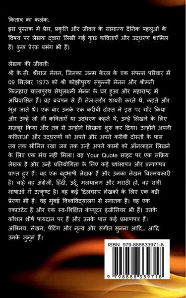 This book consists of some of the poems and Quotes written by the author on the theme of Love, Nature and general day to day aspects of life. There are some inspirational quotes too. Love includes Love found, Love lost and love re-awakened. Similarly, Nature consists of the importance of nature and how people mis-utilize the nature to their own advantages without going for the aftereffects. General consists of the general aspects of life which goes on with people and the surroundings.