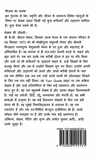 This book consists of some of the poems and Quotes written by the author on the theme of Love, Nature and general day to day aspects of life. There are some inspirational quotes too. Love includes Love found, Love lost and love re-awakened. Similarly, Nature consists of the importance of nature and how people mis-utilize the nature to their own advantages without going for the aftereffects. General consists of the general aspects of life which goes on with people and the surroundings.
