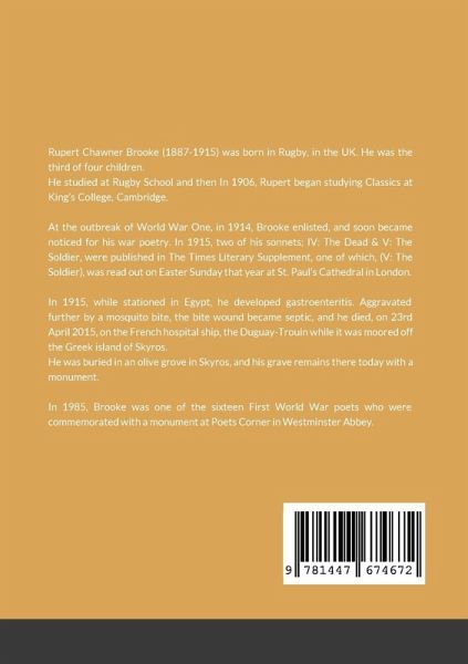 Rupert Chawner Brooke (1887-1915) was born in Rugby, in the UK. He was the third of four children. He studied at Rugby School and then In 1906, Rupert began studying Classics at King's College, Cambridge. At the outbreak of World War One, in 1914, Brooke enlisted, and soon became noticed for his war poetry. In 1915, two of his sonnets; IV: The Dead & V: The Soldier, were published in The Times Literary Supplement, one of which, (V: The Soldier), was read out on Easter Sunday that year at St. Paul's Cathedral in London. In 1915, while stationed in Egypt, he developed gastroenteritis. Aggravated further by a mosquito bite, the bite wound became septic, and he died, on 23rd April 2015, on the French hospital ship, the Duguay-Trouin while it was moored off the Greek island of Skyros. He was buried in an olive grove in Skyros, and his grave remains there today with a monument. In 1985, Brooke was one of the sixteen First World War poets who were commemorated with a monument at Poets Corner in Westminster Abbey.