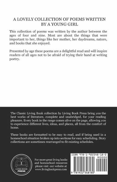This collection of poems was written by the author between the ages of four and nine. Most are about the things that were important to her, things like her mother, her daydreams, nature, and books that she enjoyed. Presented by age these poems are a delightful read and will inspire readers of all ages not to be afraid of trying their hand at writing poetry.