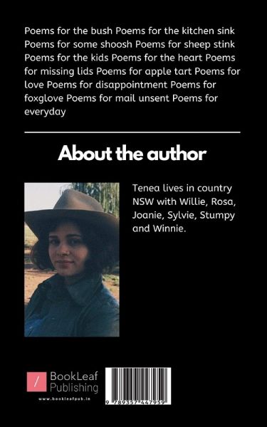 ""Poems for the bush Poems for the kitchen sink Poems for some shoosh Poems for sheep stink Poems for the kids Poems for the heart Poems for missing lids Poems for apple tart Poems for love Poems for disappointment Poems for foxglove Poems for mail unsent Poems for everyday""