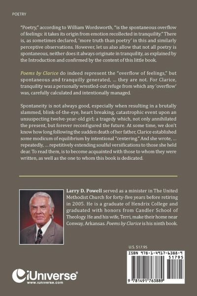 "Poetry," according to William Wordsworth, "is the spontaneous overflow of feelings: it takes its origin from emotion recollected in tranquility." There is, as sometimes declared, ‘more truth than poetry’ in this and similarly perceptive observations. However, let us also allow that not all poetry is spontaneous, neither does it always originate in tranquility, as explained by the Introduction and confirmed by the content of this little book. Poems by Clarice do indeed represent the "overflow of feelings," but spontaneous and tranquilly generated, … they are not. For Clarice, tranquility was a personally wrestled-out refuge from which any ‘overflow’ was, carefully calculated and intentionally managed. Spontaneity is not always good, especially when resulting in a brutally slammed, blink-of-the-eye, heart breaking, catastrophic event upon an unsuspecting twelve-year-old girl; a tragedy which, not only annihilated the present, but forever reconfigured the future. At some time, we don’t know how long following the sudden death of her father, Clarice established some modicum of equilibrium by intentional "centering." And she wrote, … repeatedly, … repetitively extending soulful versifications to those she held dear. To read them, is to become acquainted with those to whom they were written, as well as the one to whom this book is dedicated.