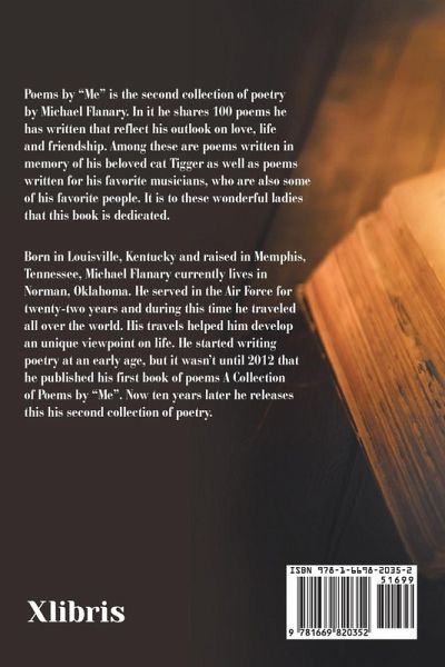 Poems by "Me" is the second collection of poetry by Michael Flanary. In it he shares 100 poems he has written that reflect his outlook on love, life and friendship. Among these are poems written in memory of his beloved cat Tigger as well as poems written for his favorite musicians, who are also some of his favorite people. It is to these wonderful ladies that this book is dedicated.