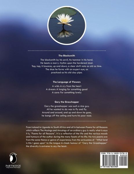 The Blacksmith The blacksmith by his anvil, his hammer in his hand. He beats a merry rhythm upon the hardened steel. Tap, tap, it bounces, up and down, a clear shrill note as old as time. The shoe he forms with an expert eye, as practiced as his old clay pipe. The Language of Flowers A wish: A cry from the heart A dream: A longing for something good A care: For something lovely Gary the Grasshopper Gary the grasshopper was such a nice guy. All he wanted to do was to fly and fly. Around and around, and up and down he goes, he bangs off the ceiling and hurts his poor nose. From Ireland to Uganda to South Africa and all in between Poems for all Reasons which reflects The Musings and Amusings of an ordinary guy is really what is says it is, "Poems for all Reasons". It is a reflection of the life and the various moods and humours of the author during the many facets of his life. No two poems are from the same theme or genre of experience, from the seriousness of "What land is this I gaze upon" to the tongue in cheek humour of "Gary the Grasshopper" the diversity is extreme to say the least.
