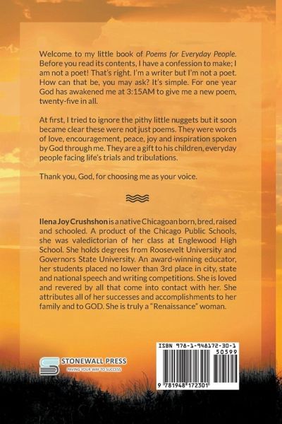 Welcome to my little book of Poems for Everyday People. Before you read its contents, I have a confession to make; I am not a poet! That's right. I'm a writer but I'm not a poet. How can that be, you may ask? It's simple. For one year God has awakened me at 3:15AM to give me a new poem, twenty-five in all. At first, I tried to ignore the pithy little nuggets but it soon became clear these were not just poems. They were words of love, encouragement, peace, joy and inspiration spoken by God through me. They are a gift to his children, everyday people facing life's trials and tribulations. Thank you, God, for choosing me as your voice.