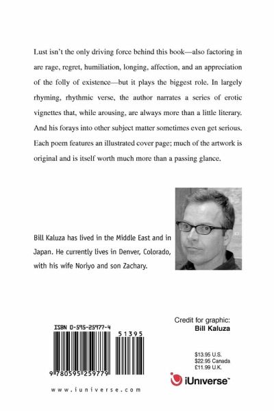 Lust isn't the only driving force behind this book--also factoring in are rage, regret, humiliation, longing, affection, and an appreciation of the folly of existence--but it plays the biggest role. In largely rhyming, rythmic verse, the author narrates a series of erotic vignettes that, while arousing, are always more than a little literary. And his forays into other subject matter sometimes even get serious. Each poem features an illustrated cover page; much of the artwork is original and is itself worth much more than a passing glance.