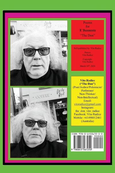 Vito Radice ("The Don") has published ten books of poems & two autobiographies.He was born in Italy & immigrated to Sydney, Australia in 1964 where he currently lives.Born in the village of "San Fele" (Province of "Basilicata"), in his "Nonna Martone's" house. The house is built into the side of the mountain and it's still there today. Abandoned!He was a young, fair skinned, freckle faced curly, redheaded Italian boy, who, with his mother and older brother, left the poverty of my rural home in Southern Italy to migrate to Australia and reunite with his father (whom he had never seen) and started a new life in Sydney, in December 1964He was 5 years young.He has been living there ever since.He is now now 65 years young.