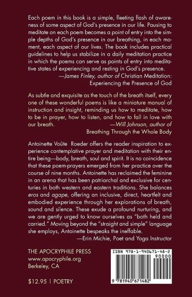 Antoinette Voûte Roeder offers the reader inspiration to experience contemplative prayer and meditation with their entire being-body, breath, soul and spirit. It is no coincidence that these poem-prayers emerged from her practice over the course of nine months. Antoinette has reclaimed the feminine in an arena that has been patriarchal and exclusive for centuries in both western and eastern traditions. She balances eros and agape, offering an inclusive, direct, heartfelt and embodied experience through her explorations of breath, sound and silence. These exude a profound nurturing, and we are gently urged to know ourselves as "both held and carried." Moving beyond the "straight and simple" language she employs, Antoinette bespeaks the ineffable. -Erin Michie, Poet and Yoga Instructor