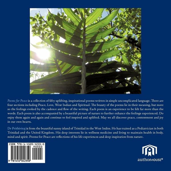 Poems for peace is a collection of fifty uplifting, inspirational poems written in simple uncomplicated language. There are four sections including,peace,love,west indian and spiritual. The beauty of the poems lie in their meaning, but more so the feelings evoked by the cadence and flow of the writing. Each poem is an experience to be felt far more than the words. Each poem is also accompanied by a beautiful picture of nature to further enhance the feelings experienced. Do enjoy them again and again and continue to feel inspired and uplifted. May we all discover peace contentment and joy in our own hearts.