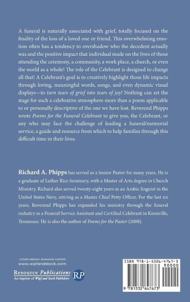 A funeral is naturally associated with grief, totally focused on the finality of the loss of a loved one or friend. This overwhelming emotion often has a tendency to overshadow who the decedent actually was and the positive impact that individual made on the lives of those attending the ceremony, a community, a work place, a church, or even the world as a whole! The role of the Celebrant is designed to change all that! A Celebrant's goal is to creatively highlight those life impacts through loving, meaningful words, songs, and even dynamic visual displays--to turn tears of grief into tears of joy! Nothing can set the stage for such a celebrative atmosphere more than a poem applicable to or personally descriptive of the one we have lost. Reverend Phipps wrote Poems for the Funeral Celebrant to give you, the Celebrant, or any who may face the challenge of leading a funeral/memorial service, a guide and resource from which to help families through this difficult time in their lives.