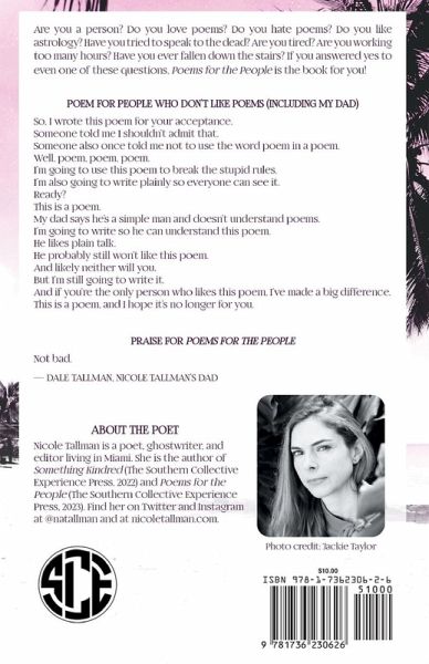 "Nicole Tallman's Poems for the People is a gorgeous and tender love song for all of us -- the grievers, the poets, the stricken and the soft. Tallman's poems highlight the beauty and heartbreak we live through, but also examine and expand what it means to truly relate with others, to know us in a way that only a friend can: by holding us together in her esteem."--- JARED BELOFF, AUTHOR OF WHO WILL CRADLE YOUR HEAD "These poems especially excel at one of my favorite things poems can do-they open up a dialogue, they start a conversation. And, like a good conversationalist, they ask you questions, they tell you about themselves, they braid together the languages of the philosophical, surprise, and the quotidian. They look you in the eye and ask you how you feel. They're poems for The Astro Poets and soft boys, for Sylvia Plath and people who say they don't pray. For poets and lovers of poetry and people who don't like poems. They're poems for Nicole herself and also for you. Poems for all of us. What a gift." --- AARON BURCH, AUTHOR OF YEAR OF THE BUFFALO "In this ambitious yet graceful collection, Nicole Tallman is quick to tell (nay, show) us what she is about. Uncommonly confident, Tallman asks what happens when we 'wade out way too far' while in the same breath lauding the 'plain talk' of poems, the girls she 'wanted to hug a little too long.' Written with a deft hand, these elegiac and tender poems promise 'permanent day or never-ending night.' Buy this book, support this impressive outing: 'where I come from, it's also about the merchandise.'" --- MICHAEL CHANG,¿¿ AUTHOR OF ALMANAC OF USELESS TALENTS "Nicole Tallman is a poet looking for the truth." --- ALEX DIMITROV, AUTHOR OF LOVE AND OTHER POEMS "Nicole Tallman writes poems for everyone and to everything. Her clear and concise diction in Poems for the People can be both comforting and cutting (sometimes within the same poem). This deft balance permits the poems to honestly explore topics as wide ranging as love, family and death, to witches, fast food and pop culture, and all without sacrificing their emotional power. Often in language, what is put most plainly is closest to the truth, and Tallman's poetics play within the logics of this axiom, conjuring a surplus of meaning through enchantments of common speech. The poet and lover of poetry will certainly find much to admire in this book, but Poems for the People is (as the title suggests) for all people; so a special warning to those who claim to be resistant to the power of poetry: beware! Given over to the spells of Tallman's lyricism, incisive wit and capacious spirit, you may find yourself not only reading her poetry, but praying along with it." --- ADRIAN DALLAS FRANDLE "I love these poems. I love that they are clear and generous gifts for real people, even while Tallman is creating art in her own wild, unique, and powerful way-a way, thankfully, that never excludes the people, the reader, that ultra-private curious audience of one who will pick up this book and find a poem that has been written just for them. P.S. On a personal note, future readers, I found myself in many many of these poems, but the one that seemed written just for me is 'Poem for the Introverts.' Which one did she write for you?" --- MAUREEN SEATON, AUTHOR OF UNDERSEA <