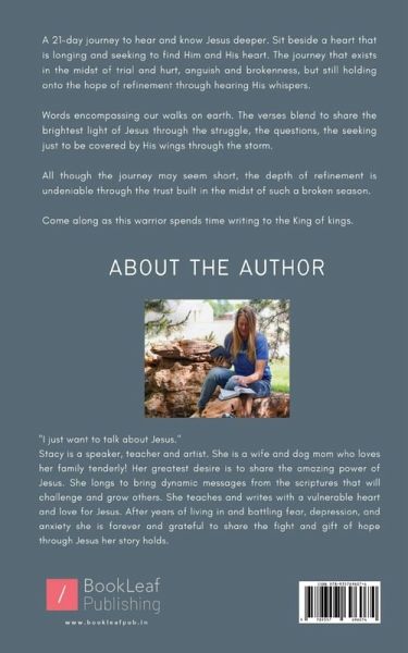 ""A 21-day journey to hear and know Jesus deeper. Sit beside a heart that is longing and seeking to find Him and His heart. The journey that exists in the midst of trial and hurt, anguish and brokenness, but still holding onto the hope of refinement through hearing His whispers. Words encompassing our walks on earth. The verses blend to share the brightest light of Jesus through the struggle, the questions, the seeking just to be covered by His wings through the storm. All though the journey may seem short, the depth of refinement is undeniable through the trust built in the midst of such a broken season. Come along as this warrior spends time writing to the King of kings.""