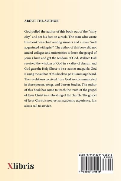 ABOUT THE AUTHOR God pulled the author of this book out of the "miry clay" and set his feet on a rock. The man who wrote this book was chief among sinners and a man "well acquainted with grief". The author of this book did not attend colleges and universities to learn the gospel of Jesus Christ and get the wisdom of God. Wallace Hall received the wisdom of God in a valley of despair and God gave the Holy Ghost to be a teacher and guide. God is using the author of this book to get His message heard. The revelations received from God are communicated in these poems, songs, and Lesson Studies. The author of this book has come to teach the truth of the gospel of Jesus Christ in a refreshing of the church. The gospel of Jesus Christ is not just an academic experience. It is also a call to service.