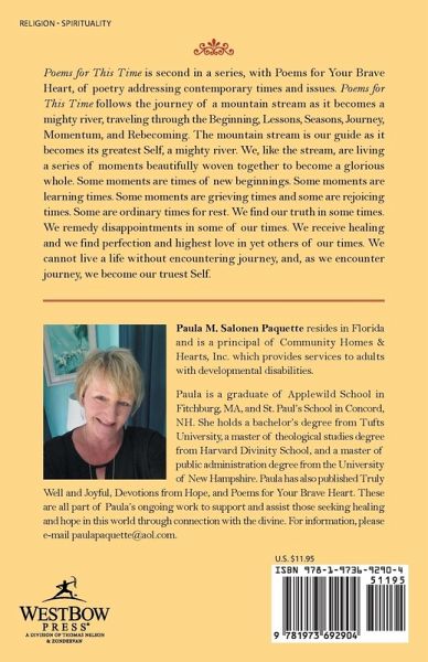 Poems for This Time is second in a series, with Poems for Your Brave Heart, of poetry addressing contemporary times and issues. Poems for This Time follows the journey of a mountain stream as it becomes a mighty river, traveling through the Beginning, Lessons, Seasons, Journey, Momentum, and Rebecoming. The mountain stream is our guide as it becomes its greatest Self, a mighty river. We, like the stream, are living a series of moments beautifully woven together to become a glorious whole. Some moments are times of new beginnings. Some moments are learning times. Some moments are grieving times and some are rejoicing times. Some are ordinary times for rest. We find our truth in some times. We remedy disappointments in some of our times. We receive healing and we find perfection and highest love in yet others of our times. We cannot live a life without encountering journey, and, as we encounter journey, we become our truest Self.