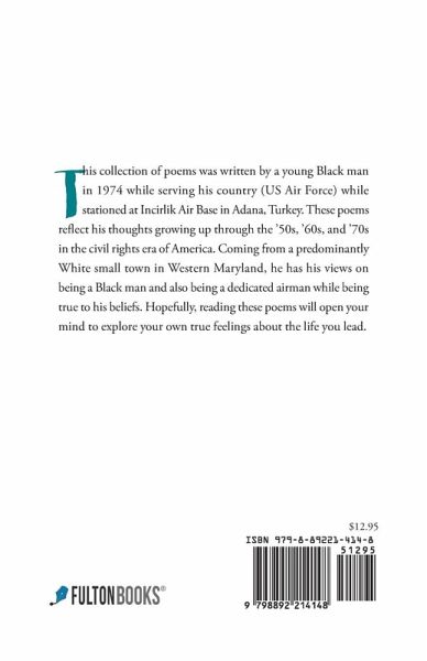 This collection of poems was written by a young Black man in 1974 while serving his country (US Air Force) while stationed at Incirlik Air Base in Adana, Turkey. These poems reflect his thoughts growing up through the '50s, '60s, and '70s in the civil rights era of America. Coming from a predominantly White small town in Western Maryland, he has his views on being a Black man and also being a dedicated airman while being true to his beliefs. Hopefully, reading these poems will open your mind to explore your own true feelings about the life you lead.