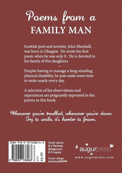Scottish poet and novelist, John Marshall, was born in Glasgow. He wrote his first poem when he was only 9. He is devoted to his family of five daughters. Despite having to manage a long-standing physical disability, he puts aside some time to write nearly every day. A selection of his observations and experiences are poignantly expressed in the poems in this book.