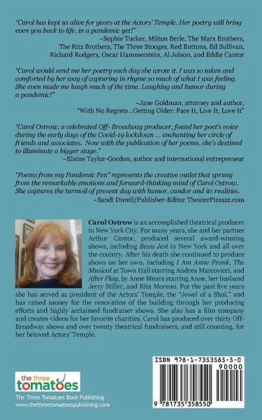 When the world shuts down, what do you do? When New York City went into lockdown, Carol Ostrow stayed glued to her TV, afraid of the present and not knowing what the future would bring. But then one day, instead of calling a friend for a "normal" conversation, she picked up her pen and wrote a poem, finding a bit of humor during a dark time. She sent it to friends who appreciated the humor and wit and cheered her on. She wrote one poem a day for at least eighteen weeks. Her wonderful, loyal friends would receive those she emailed, review the contents, and encourage her to write more. Writing became an obsession, almost therapy. Better than taking medication. Hunkered down, hooked on a terrible Netflix series, feeling rather depressed without being able to escape her surroundings to enjoy the theatre, opera, ballet, restaurants and too afraid to venture out in the hall to empty her garbage, she put into rhyme her feelings. The results are humorous, witty, reflective, and sometimes poignant poems that cover the gamut from her expanding derriere, the art of folding toilet paper, reflections on ex-lovers, growing older, and the importance of friends. A morning ritual I have this talent with rare toilet paper, Like a gift, a talent, a great dress maker. I fold, I use, I fold again, Over the bowl, you know. No more space, 'tis time to throw, I do let go, Sometimes, it's true, I feel like fainting. This paper, so rare as a Picasso painting. Did you ever think we would come to this? Forgive me now, I have to diss, Goddamn, no paper, I have to piss. Carol's poems are a reminder to all of us that "This too shall pass." Life does change, we can all adapt and get used to what the future has in store. We will be fine. Just keep loved ones, friends, and the things we hold most dear in perspective, and we will come out of this stronger and healthier than ever.
