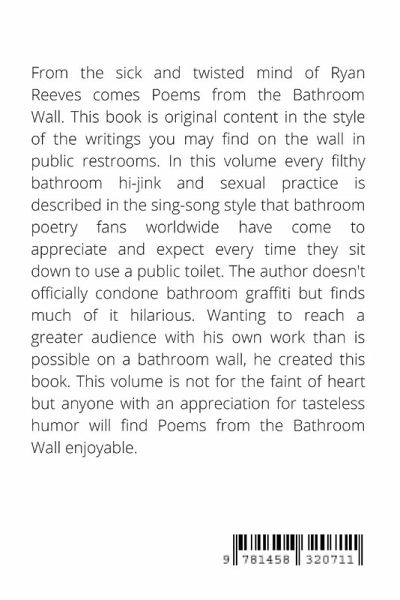 From the sick and twisted mind of Ryan Reeves comes Poems from the Bathroom Wall. This book is original content in the style of the writings you may find on the wall in public restrooms. In this volume every filthy bathroom hi-jink and sexual practice is described in the sing-song style that bathroom poetry fans worldwide have come to appreciate and expect every time they sit down to use a public toilet. The author doesn't officially condone bathroom graffiti but finds much of it hilarious. Wanting to reach a greater audience with his own work than is possible on a bathroom wall, he created this book. This volume is not for the faint of heart but anyone with an appreciation for tasteless humor will find Poems from the Bathroom Wall enjoyable.