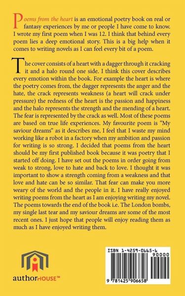 Poems from the heart is an emotional poetry book on real or fantasy experiences by me or people I have come to know. I wrote my first poem when I was 12. I think that behind every poem lies a deep emotional story. This is a big help when it comes to writing novels as I can feel every bit of a poem. The cover consists of a heart with a dagger through it cracking it and a halo round one side. I think this cover describes every emotion within the book. For example the heart is where the poetry comes from, the dagger represents the anger and the hate, the crack represents weakness (a heart will crack under pressure) the redness of the heart is the passion and happiness and the halo represents the strength and the mending of a heart. The fear is represented by the crack as well. Most of these poems are based on true life experiences. My favourite poem is "My saviour dreams" as it describes me, I feel that I waste my mind working like a robot in a factory when my ambition and passion for writing is so strong. I decided that poems from the heart should be my first published book because it was poetry that I started off doing. I have set out the poems in order going from weak to strong, love to hate and back to love. I thought it was important to show a strength coming from a weakness and that love and hate can be so similar. That fear can make you more weary of the world and the people in it. I have really enjoyed writing poems from the heart as I am enjoying writing my novel. The poems towards the end of the book i.e. The London bombs, my single last tear and my saviour dreams are some of the most recent ones. I just hope that people will enjoy reading them as much as I have enjoyed writing them.