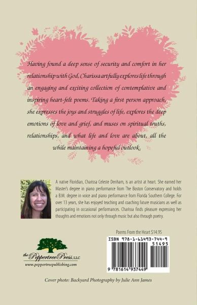 Having found a deep sense of security and comfort in her relationship with God, Charissa artfully explores life through an engaging and exciting collection of contemplative and inspiring heart-felt pomes. Taking a first person approach , she expresses the joys and struggles of life, explores the deep emotions of love and grief, and muses on spiritual truths, relationships, and what life and love are about, all the while maintaining a hopeful outlook. About the Author: A native Floridian, Charisa Celeste Denham, is an artist at heart. She earned her Master's degree in piano performance from The Boston Conservatory and holds a B.M. degree in voice and piano performance from Florida Southern College. For over 13 years, she has enjoyed teaching and coaching future musicians as well as participating in occasional performances. Charissa finds pleasure expressing her thoughts and emotions not only through music but also through poetry.