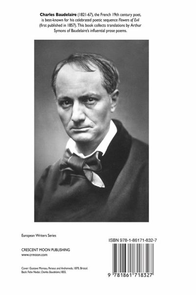 CHARLES BAUDELAIRE POEMS IN PROSE Poems translated by Arthur Symons Charles Baudelaire (1821-1867) was a celebrated 19th century French poet, author of the famous Flowers of Evil poetic sequence, first published in 1857. Baudelaire is a poet's poet par excellence, a brilliant craftsman who produced some of the finest poems in the French language. Baudelaire was known as a dandy who led a bohemian lifestyle; he knew many of the artists of the era (Manet, Nadar, Delacroix, and Gautier). Baudelaire's influence on subsequent poets and artists has been immense. This edition of Baudelaire's prose poems is a selection by British author Arthur Symons. The book includes two introductions to Baudelaire. With the French text of Baudelaire's poetry. Illustrated. 92 pages. Paperback, with a full colour cover. www.crmoon.com