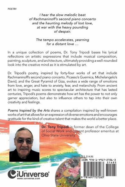 This is a book of poems that is based on the premise that products of art such as musical composition, painting, sculpture, and architecture can serve as stimuli for the development of original poems. These products of art evoke a range of emotions from love, anger, and hate to anxiety, fear, and melancholy; and they can be expressed in original poems. Forty-four works of art were identified; for example, Rachmaninoff's Second Piano Concerto, Picasso's Guernica, Michelangelo's David, and the Great Pyramid of Giza. For each of the works of art an original poem emphasizing feelings and emotions was developed.