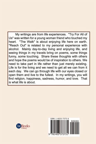 My writings are from life experiences, mainly day-to-day living and enjoying life. We need to take part in life rather than just merely existing. In my writings, you will find religion, happiness, sadness, humor, and love.