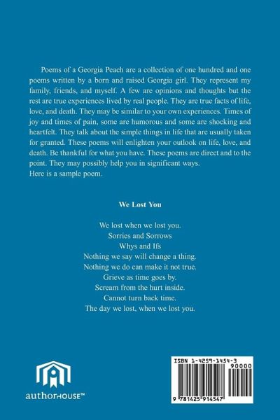 Poems of a Georgia Peach are a collection of one hundred and one poems written by a born and raised Georgia girl. They represent her family, friends, and herself. A few are opinions and thoughts but the rest are true experiences lived by real people. They are true facts of life, love, and death. They may be similar to your own experiences. Times of joy and times of pain, some are humorous and some are shocking and heartfelt. They talk about the simple things in life that are usually taken for granted. These poems will enlighten your outlook on life, love, and death. Be thankful for what you have. These poems are direct and to the point. They may possibly help you in significant ways.