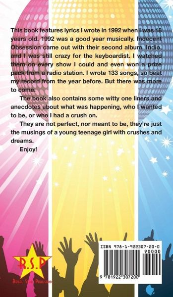 This book features lyrics I wrote in 1992 when I was 18 years old. 1992 was a good year musically. Indecent Obsession came out with their second album, Indio, and I was still crazy for the keyboardist. I watched them on every show I could and even won a prize pack from a radio station. I wrote 133 songs, so beat my record from the year before. But there was more to come. The book also contains some witty one liners and anecdotes about what was happening, who I wanted to be, or who I had a crush on. They are not perfect, nor meant to be, they're just the musings of a young teenage girl with crushes and dreams. Enjoy!