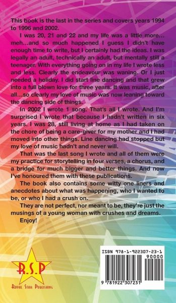 This book is the last in the series and covers years 1994 to 1996 and 2002. I was 20, 21 and 22 and my life was a little more...meh...and so much happened I guess I didn't have enough time to write, but I certainly had the ideas. I was legally an adult, technically an adult, but mentally still a teenager. With everything going on in my life I wrote less and less. Clearly the endeavour was waning. Or I just needed a holiday. I did start line dancing and that grew into a full blown love for three years. It was music, after all...so clearly my love of music was now leaning toward the dancing side of things. In 2002 I wrote 1 song. That's all I wrote. And I'm surprised I wrote that because I hadn't written in six years. I was 28, still living at home as I had taken on the chore of being a care-giver for my mother and I had moved into other things. Line dancing had stopped but my love of music hadn't and never will. That was the last song I wrote and all of them were my practice for storytelling in four verses, a chorus, and a bridge for much bigger and better things. And now I've honoured them with these publications. The book also contains some witty one liners and anecdotes about what was happening, who I wanted to be, or who I had a crush on. They are not perfect, nor meant to be, they're just the musings of a young woman with crushes and dreams. Enjoy!