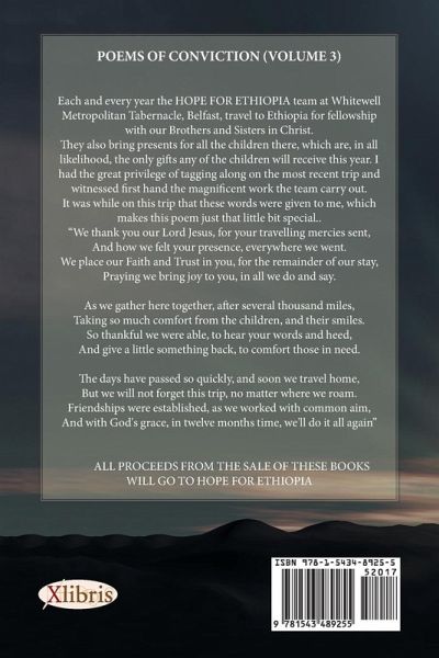 Each and every year, the Hope for Ethiopia team at Whitewell Metropolitan Tabernacle, Belfast, travel to Ethiopia for fellowship with our Brothers and Sisters in Christ. They also bring presents for all the children there, which are, in all likelihood, the only gifts any of the children will receive this year. I had the great privilege of tagging along on the most recent trip and witnessed firsthand the magnificent work the team carried out. It was while on this trip that these words were given to me, which makes this poem just that little bit special: We thank you, our Lord Jesus, for your travelling mercies sent, And how we felt your presence everywhere we went. We place our faith and trust in you for the remainder of our stay, Praying we bring joy to you in all we do and say. As we gather here together, after several thousand miles, Taking so much comfort from the children and their smiles. So thankful we were able to hear your words and heed, And give a little something back to comfort those in need. The days have passed so quickly, and soon we travel home, But we will not forget this trip no matter where we roam. Friendships were established, as we worked with common aim, And with God's grace, in twelve moths time, we'll do it all again. All proceeds from the sale of these books will go to Hope for Ethiopia.