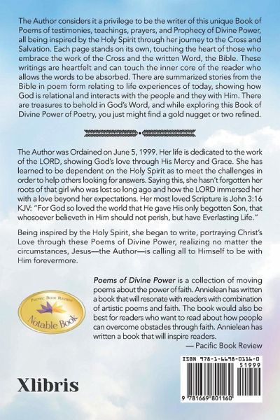 The Author considers it a privilege to be the writer of this unique Book of Poems of testimonies, teachings, prayers, and Prophecy of Divine Power, all being inspired by the Holy Spirit through her journey to the Cross and Salvation. Each page stands on its own, touching the heart of those who embrace the work of the Cross and the written Word, the Bible. These writings are heartfelt and can touch the inner core of the reader who allows the words to be absorbed. There are summarized stories from the Bible in poem form relating to life experiences of today, showing how God is relational and interacts with the people and they with Him. There are treasures to behold in God's Word, and while exploring this Book of Divine Power of Poetry, you just might find a gold nugget or two refined.