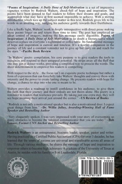 "Poems of Inspiration: A Daily Dose of Self-Motivation is a set of impressive vignettes written by Rodrick Walters chock-full of hope and inspiration. The poems have been penned to fuel readers to follow their dreams and goals, and accomplish what may have at first seemed impossible to achieve. With a stirring introduction which tees up the subject matter in this text, Rodrick gives life to his words in an amazing way, nudging his audience gently towards their fruitfulness. Like a firefly light, Walters' work is deeply introspective with direct prose making these poems linger on and return from time to time. The poet has employed an adept control of imagery, making the key message easily digestible. Poems of Inspiration: A Daily Dose of Self-Motivation is no doubt a literary salve which deserves a place on everyone's nightstand or coffee table. Its fundamental message of hope and inspiration is current and timeless. It's a worthy companion in the journey of life and a constant reminder not to give up but carry on and reach for the stars." - Pacific Book Review "In Walters' poetry compilation, his core purpose is to give readers the tools to recognize and respond to their untapped potential. He strips away all the fluff that one may get in denser works, providing a simplified way to process the words. The sheer determination to empower his readers is compelling. With respect to the style...the focus isn't on exquisite poetic technique but rather a form of expression that can forcefully take Walters' thoughts and convey them with intensity and the power to create lasting change. He presents readers with hope for change, a chance to step into who one is meant to be. Walters provides a roadmap to instill confidence in his audience, to give them the faith that their journey and their ordeals are not theirs alone. His poetry is a reminder to readers that resilience prevails. By taking just one extra step, they will see hope awaiting their arrival just around the corner." - US Review of Books "Rodrick is not only a motivational speaker but is also a motivational doer. I expect great things from him." -Dr. Willie Jolley, Awarding-Winning Hall of Fame Speaker and Bestselling Author "Very eloquently spoken. I was very impressed with your story of overcoming so many obstacles to become the talented communicator that you are today." -Bob Losure, Former CNN Anchor and Bestselling Author