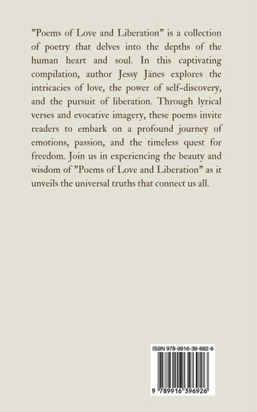 "Poems of Love and Liberation" is a collection of poetry that delves into the depths of the human heart and soul. In this captivating compilation, author Jessy Jänes explores the intricacies of love, the power of self-discovery, and the pursuit of liberation. Through lyrical verses and evocative imagery, these poems invite readers to embark on a profound journey of emotions, passion, and the timeless quest for freedom. Join us in experiencing the beauty and wisdom of "Poems of Love and Liberation" as it unveils the universal truths that connect us all. Copyright © 2024 Book Fairy Publishing