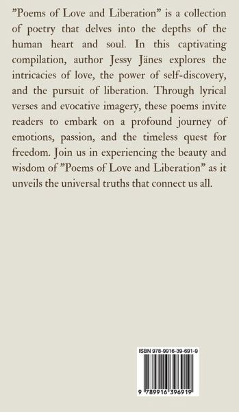 "Poems of Love and Liberation" is a collection of poetry that delves into the depths of the human heart and soul. In this captivating compilation, author Jessy Jänes explores the intricacies of love, the power of self-discovery, and the pursuit of liberation. Through lyrical verses and evocative imagery, these poems invite readers to embark on a profound journey of emotions, passion, and the timeless quest for freedom. Join us in experiencing the beauty and wisdom of "Poems of Love and Liberation" as it unveils the universal truths that connect us all. Copyright © 2024 Book Fairy Publishing