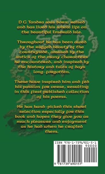 Poems of My Homeland Irish Poems from the Heart By D.G. Tandra Ireland-land of emerald fields, ancient traditions, and stories woven through generations. In Poems of My Homeland, D.G. Tandra captures the essence of Irish life, love, and legacy through a heartfelt collection of verse. Rooted in the beauty of the Irish landscape and the richness of its people, these poems speak to the soul-whispering of home, nostalgia, and the bonds that transcend time. From the rolling hills of Armagh to the bustling streets of Belfast, each piece paints a vivid picture of a nation that has endured hardship, celebrated triumph, and carried its traditions forward with pride. This collection is an invitation-to walk through history, to embrace the humour and heartache of Irish life, and to find the threads of your own story within its pages. Whether reminiscing on days gone by, celebrating the enduring spirit of the Irish people, or reflecting on the dream of peace, these poems stir the heart and call you home. For lovers of poetry, Irish culture, and storytelling in its purest form, Poems of My Homeland is a treasure that will linger long after the last page is turned.