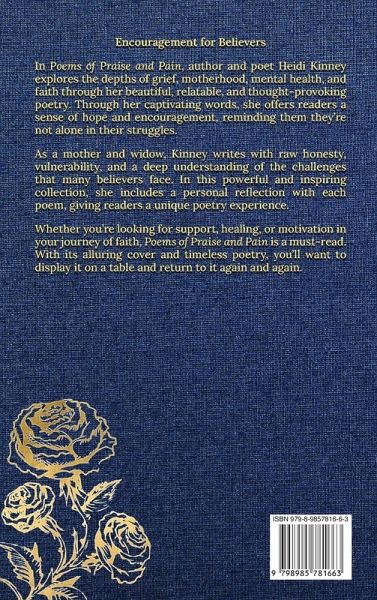 Encouragement for Believers In Poems of Praise and Pain, author and poet Heidi Kinney explores the depths of grief, motherhood, mental health, and faith through her beautiful, relatable, and thought-provoking poetry. Through her captivating words, she offers readers a sense of hope and encouragement, reminding them they're not alone in their struggles. As a mother and widow, Kinney writes with raw honesty, vulnerability, and a deep understanding of the challenges that many believers face. In this powerful and inspiring collection, she includes a personal reflection with each poem, giving readers a unique poetry experience. Whether you're looking for support, healing, or motivation in your journey of faith, Poems of Praise and Pain is a must-read. With its alluring cover and timeless poetry, you'll want to display it on a table and return to it again and again.
