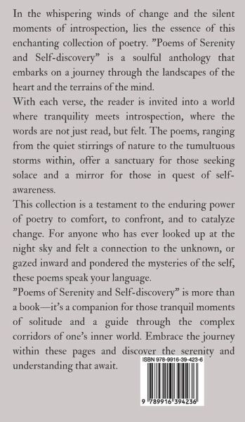 In the whispering winds of change and the silent moments of introspection, lies the essence of this enchanting collection of poetry. "Poems of Serenity and Self-discovery" is a soulful anthology that embarks on a journey through the landscapes of the heart and the terrains of the mind.With each verse, the reader is invited into a world where tranquility meets introspection, where the words are not just read, but felt. The poems, ranging from the quiet stirrings of nature to the tumultuous storms within, offer a sanctuary for those seeking solace and a mirror for those in quest of self-awareness.This collection is a testament to the enduring power of poetry to comfort, to confront, and to catalyze change. For anyone who has ever looked up at the night sky and felt a connection to the unknown, or gazed inward and pondered the mysteries of the self, these poems speak your language."Poems of Serenity and Self-discovery" is more than a book-it's a companion for those tranquil moments of solitude and a guide through the complex corridors of one's inner world. Embrace the journey within these pages and discover the serenity and understanding that await. Copyright © 2023 Book Fairy Publishing