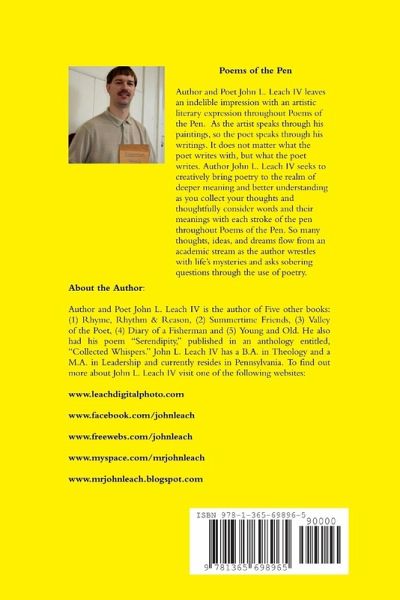 Author and Poet John L. Leach IV leaves an indelible impression with an artistic literary expression throughout Poems of the Pen. As the artist speaks through his paintings, so the poet speaks through his writings. It does not matter what the poet writes with, but what the poet writes. Author John L. Leach IV seeks to creatively bring poetry to the realm of deeper meaning and better understanding as you collect your thoughts and thoughtfully consider words and their meanings with each stroke of the pen throughout Poems of the Pen. So many thoughts, ideas, and dreams flow from an academic stream as the author wrestles with life's mysteries and asks sobering questions through the use of poetry.