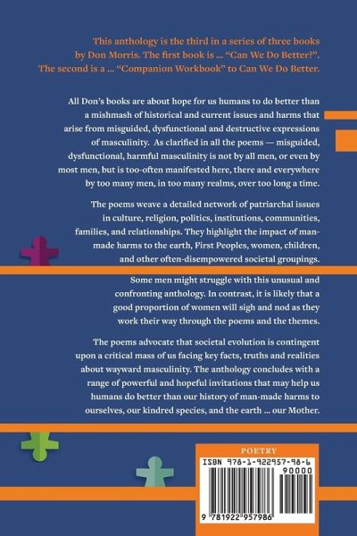 This anthology is the third in a series of three books by Don Morris. The first book is "Can We Do Better". The second is a "Companion Workbook" to Can We Do Better. All Don's books are about hope for us humans to do better than a mishmash of historical and current issues and harms that arise from misguided, dysfunctional and destructive expressions of masculinity. As clarified in all the poems - misguided, dysfunctional, harmful masculinity is not by all men, or even by most men, but is too-often manifested here, there, and everywhere by too many men, in too many realms, over too long a time. The poems weave a detailed network of patriarchal issues in culture, religion, politics, institutions, communities, families, and relationships. They highlight the impact of manmade harms to the earth, First Peoples, women, children, and other often-disempowered societal groups. Some men might struggle with this unusual and confronting anthology. In contrast, it is likely that a good proportion of women will nod and sigh as they work their way through the poems and themes. The poems advocate that societal evolution is contingent upon a critical mass of us facing key facts, truths and realities about wayward masculinity. The anthology concludes with a range of powerful and hopeful invitations that may help us humans do better than our history of man-made harms to ourselves, our kindred species, and the earth ... our Mother.