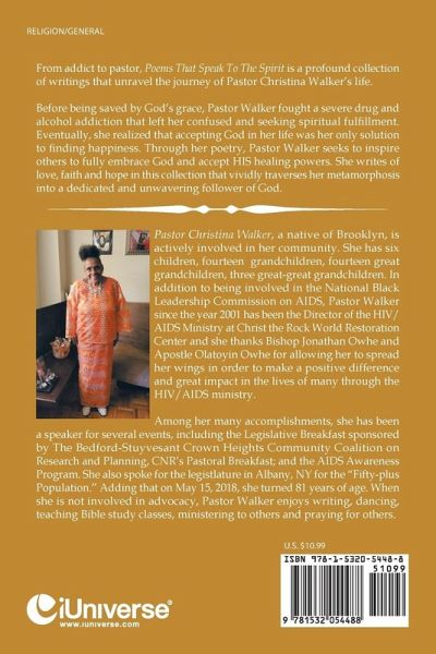 From addict to pastor, Poems That Speak To The Spirit is a profound collection of writings that unravel the journey of Pastor Christina Walker's life. Before being saved by God's grace, Pastor Walker fought a severe drug and alcohol addiction that left her confused and seeking spiritual fulfillment. Eventually, she realized that accepting God in her life was her only solution to finding happiness. Through her poetry, Pastor Walker seeks to inspire others to fully embrace God and accept HIS healing powers. She writes of love, faith and hope in this collection that vividly traverses her metamorphosis into a dedicated and unwavering follower of God.