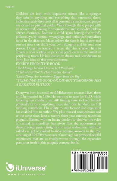 Children are born with inquisitive minds; like a spongue they take in anything and everything that surrounds them. indiscriminately they see it all as personal instructors, and people are viewed as parental guides.Walk through these pasges with an open mind, looking for motivational and somewhat hidden deeper meanings. Become a child again leaving the world's philosophys, bi-partisan wranglings, and unfounded prejudices far of in the distance. Make believe the slate is brand new and you are now free think your own thoughts and be your own person. Doug has learned a secret that has enabled him to unlock a door leading to personal peace even in the midst of perplexing times. He has learned to dream and now dreams to learn. Join him on this great adventure. EXERPS FROM THE BOOK "The Message In Your Dreams Is A Possibility" "A Talent Is A Tool To Help You Get Ahead" "Little Things Are Sometimes Bigger Than The Big" " TODAY MAY BE GOOD OR BAD BUT TOMORROW HAS A GREATER FUTURE "