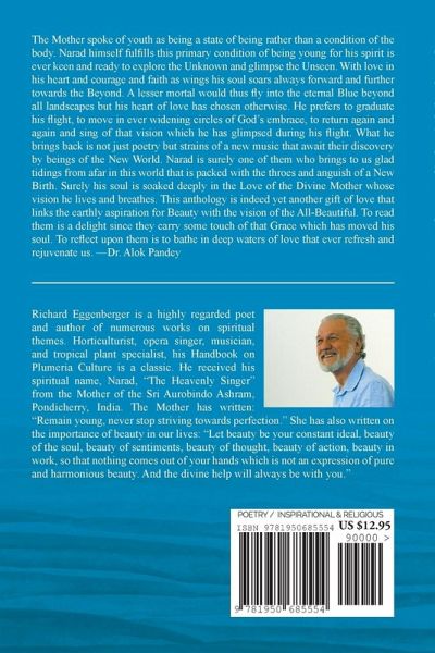 The Mother spoke of youth as being a state of being rather than a condition of the body. Narad himself fulfills this primary condition of being young for his spirit is ever keen and ready to explore the Unknown and glimpse the Unseen. With love in his heart and courage and faith as wings his soul soars always forward and further towards the Beyond. A lesser mortal would thus fly into the eternal Blue beyond all landscapes but his heart of love has chosen otherwise. He prefers to graduate his flight, to move in ever widening circles of God's embrace, to return again and again and sing of that vision which he has glimpsed during his flight. What he brings back is not just poetry but strains of a new music that await their discovery by beings of the New World. Narad is surely one of them who brings to us glad tidings from afar in this world that is packed with the throes and anguish of a New Birth. Surely his soul is soaked deeply in the Love of the Divine Mother whose vision he lives and breathes. This anthology is indeed yet another gift of love that links the earthly aspiration for Beauty with the vision of the All-Beautiful. To read them is a delight since they carry some touch of that Grace which has moved his soul. To reflect upon them is to bathe in deep waters of love that ever refresh and rejuvenate us. -Dr. Alok Pandey