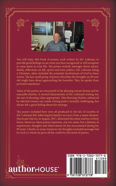 You will enjoy this book of poems, each written by Mr. Lohman, to provide good feelings on an event you have recognized or will recognize at some point in your life. The poems include messages about nature, family, reflections on life, sports and even politics. Mr. Lohman, being a Christian, often included the potential involvement of God in these events. The last small group of poems describes the thoughts an 89 year old might have about approaching the hereafter. This, he speaks from personal experience. Many of the poems are structured in the pleasing sonnet format and its enjoyable rhythm. A second characteristic of Mr. Lohman's writing was the use of rhyming when appropriate. This rhyming rhythm, enhanced by selected comma use, made writing poetry mentally challenging, but always left a good feeling about the message. The poems included here were all produced in the last 24 months of Mr. Lohman's life, following his family's recovery from a major disaster; Hurricane Harvey, in August, 2017, destroyed the entire interior of their home. However, these poems represent, not two years, but a lifetime of experiences, thoughts and observations he has encountered during his 89 years. Clearly, in many instances, his thoughts included messages led by God, to whom he gives all the credit for this book of poems.