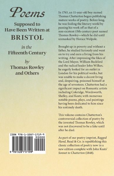 In 1763, an 11-year-old boy named Thomas Chatterton began publishing mature works of poetry. Before long, he was fooling the literary world by passing his work off as that of a non-existent 15th-century poet named Thomas Rowley-which he did until unmasked by Horace Walpole. Brought up in poverty and without a father, he studied furiously and went on to try and earn a living from his writing. After impressing the likes of the Lord Mayor, William Beckford and the radical leader John Wilkes, he eagerly looked for an outlet in London for his political works, but was unable to make a decent living and, despairing, poisoned himself at the age of seventeen. Chatterton had a significant impact on Romantic artists including Coleridge, Wordsworth, Shelley, and Keats; with numerous notable poems, plays, and paintings having been dedicated to him since his untimely death. This volume contains Chatterton's controversial collection of poetry by the invented Thomas Rowley, which was not discovered to be a fake until after he died. Contents include: "Preface", "Introductory Account of the Several Pieces Contained in this Volume", "Eclogue the First", "Eclogue the Second", "Eclogue the Third", "Elinoure and Juga", "To Johne Ladgate", "Songe to Ælla, Lorde of the Castel of Brystowe Ynne Daies of Yore", "Lydgate's Answer", "The Tournament. An Interlude", "Bristowe Tragedie Or, the Dethe of Syr Charles Bawdin", etc. As part of our poetry imprint, "Ragged Hand", Read & Co. is republishing this classic collection of poetry now in a new edition complete with John Keats' "Sonnet to Chatterton" (1848).