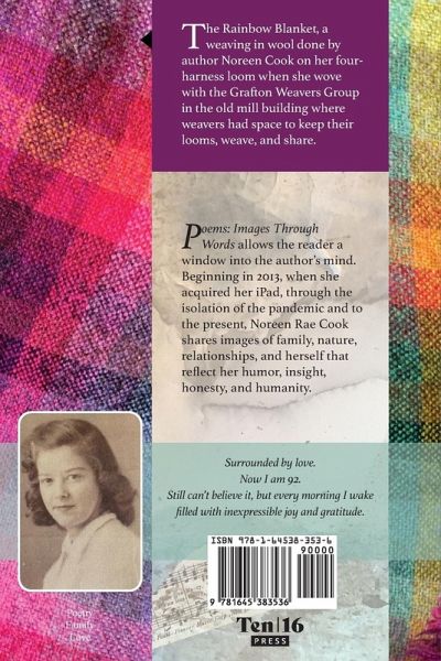 Poems: Images Through Words allows the reader a window into the author's mind. Beginning in 2013, when she acquired her iPad, through the isolation of the pandemic and to the present, Noreen Rae Cook shares images of family, nature, relationships, and herself that reflect her humor, insight, honesty, and humanity. Proceeds from this book will be donated to nonprofit organization Courage MKE, which provides resources to LGBTQ+ youth. Visit their website at www.couragemke.org