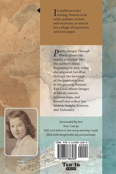 Poems: Images Through Words allows the reader a window into the author's mind. Beginning in 2013, when she acquired her iPad, through the isolation of the pandemic and to the present, Noreen Rae Cook shares images of family, nature, relationships, and herself that reflect her humor, insight, honesty, and humanity. ¿¿Proceeds from this book will be donated to nonprofit organization Courage MKE, which provides resources to LGBTQ+ youth. Visit their website at www.couragemke.org