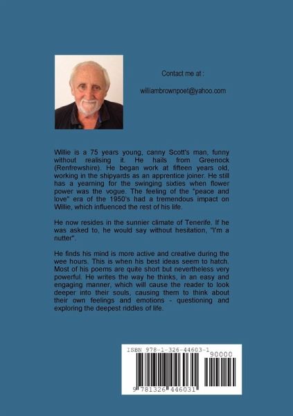 Willie is a 75 years young, canny Scott's man, funny without realising it. He hails from Greenock (Renfrewshire). He began work at fifteen years old, working in the shipyards as an apprentice joiner. He still has a yearning for the swinging sixties when flower power was the vogue. The feeling of the "peace and love" era of the 1950's had a tremendous impact on Willie, which influenced the rest of his life. He now resides in the sunnier climate of Tenerife. If he was asked to, he would say without hesitation, "I'm a nutter". He finds his mind is more active and creative during the wee hours. This is when his best ideas seem to hatch. Most of his poems are quite short but nevertheless very powerful. He writes the way he thinks, in an easy and engaging manner, which will cause the reader to look deeper into their souls, causing them to think about their own feelings and emotions - questioning and exploring the deepest riddles of life.